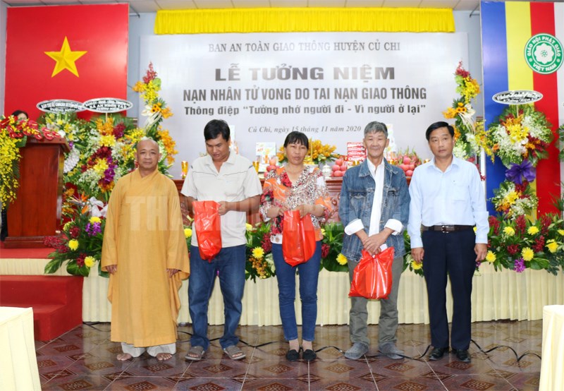 Đồng chí Nguyễn Hữu Hoài Phú, Chủ tịch UBND huyện, Trưởng Ban An toàn giao thông huyện và đại diện Ban Trị sự Giáo hội Phật giáo huyện Củ Chi tặng quà cho thân nhân người tử vong, nạn nhân do tai nạn giao thông.(Thanhuytphcm.vn) - Sáng 15/11, tại chùa Hoằng Linh, xã An Nhơn Tây, huyện Củ Chi, Ban An toàn giao thông huyện Củ Chi đã tổ chức lễ tưởng niệm nạn nhân tử vong do tai nạn giao thông với thông điệp “Tưởng nhớ người đi - Vì người ở lại”.