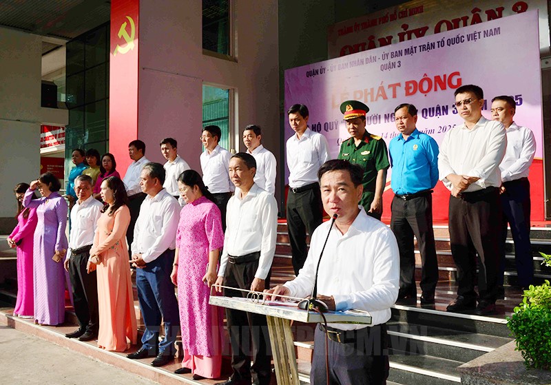 (Thanhuytphcm.vn) - Sáng 14/4, Quận ủy, UBND, Ủy ban MTTQ Việt Nam Quận 3 tổ chức Lễ phát động ủng hộ quỹ “Vì người nghèo” năm 2025. Tham dự có các đồng chí: Nguyễn Thanh Xuân, Thành ủy viên. Bí thư Quận ủy Quận 3; Nguyễn Thành Nam, Phó Bí thư Thường trực Quận ủy; Võ Văn Đức, Phó Bí thư Quận ủy, Chủ tịch UBND quận; Huỳnh Gia Giang, Ủy viên Ban Thường vụ, Chủ tịch Ủy ban MTTQ Việt Nam quận; các đồng chí trong Ban Thường vụ Quận ủy; cán bộ, công chức, viên chức, chiến sĩ lực lượng vũ trang thuộc các phòng, ban ngành, cơ quan, đơn vị đoàn thể thuộc Quận ủy, UBND quận; đại diện Hội Doanh nghiệp Quận 3.