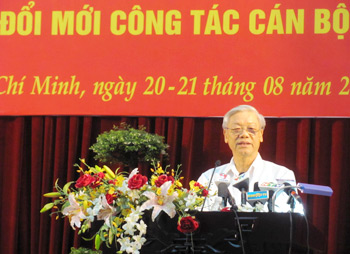 (Website TU) - Ngày 20/8, tại TPHCM, được sự ủy quyền của Ban Bí thư Trung ương Đảng, Ban Tổ chức Trung ương đã tổ chức Hội nghị cán bộ toàn quốc triển khai Kết luận số 24-KL/TW của Bộ Chính trị về đẩy mạnh công tác quy hoạch và luân chuyển cán bộ lãnh đạo, quản lý đến năm 2020 và những năm tiếp theo. Tham dự hội nghị có đại diện lãnh đạo và Vụ trưởng, Trưởng ban Tổ chức cán bộ các ban Đảng, cơ quan Đảng ở Trung ương, các bộ, ngành, đoàn thể, cơ quan, đơn vị sự nghiệp ở Trung ương; một số trường đại học, tập đoàn, Tổng công ty Nhà nước đặc biệt quan trọng; các Tỉnh ủy, Thành ủy trực thuộc Trung ương. Tổng Bí thư Nguyễn Phú Trọng tham dự và chỉ đạo hội nghị.