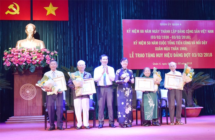 (Thanhuytphcm.vn) - Sáng 2/2, Quận ủy - HĐND - UBND - Ủy ban MTTQ Việt Nam Quận 4 tổ chức kỷ niệm 88 năm Ngày thành lập Đảng Cộng sản Việt Nam (3/2/1930 - 3/2/2018), kỷ niệm 50 năm cuộc Tổng tiến công và nổi dậy Xuân Mậu Thân 1968, trao tặng Huy hiệu Đảng đợt 3/2/2018. Tham dự lễ có Phó Bí thư Thành ủy, Chủ tịch HĐND TPHCM Nguyễn Thị Quyết Tâm.