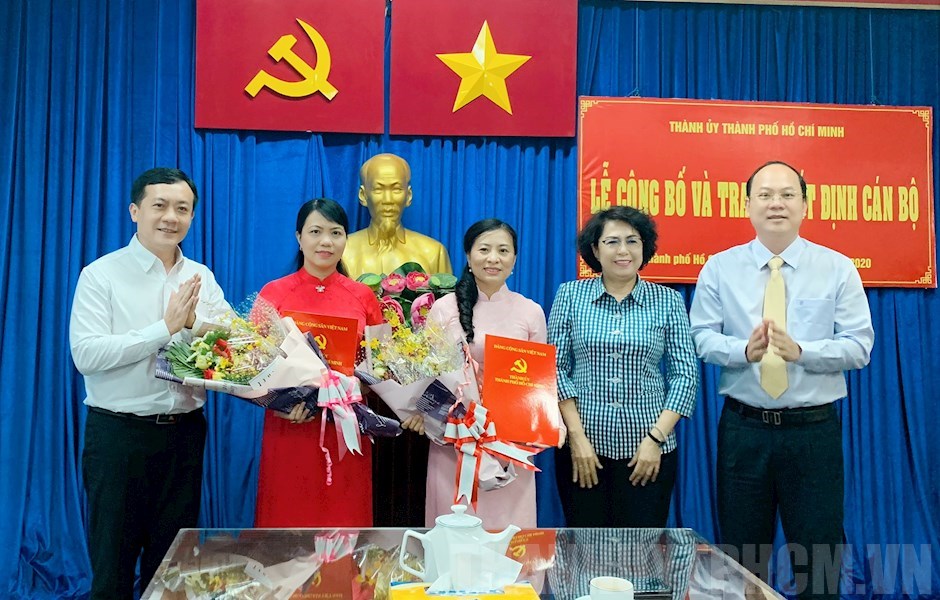 Lãnh đạo Thành phố trao quyết định cho đồng chí Vũ Thị Huỳnh Mai và đồng chí Phan Kiều Thanh Hương(Thanhuytphcm.vn) - Chiều 4/6, Thành ủy TPHCM tổ chức lễ công bố và trao quyết định điều động cán bộ. Đến dự có các đồng chí Nguyễn Hồ Hải, Ủy viên Ban Thường vụ Thành ủy, Trưởng Ban Tổ chức Thành ủy TPHCM; Tô Thị Bích Châu, Ủy viên Ban Thường vụ Thành ủy, Chủ tịch Ủy ban MTTQ Việt Nam Thành phố; Hà Phước Thắng, Ủy viên UBND TP, Chánh Văn phòng UBND Thành phố; Ngô Thành Tuấn, Bí thư Quận ủy, Chủ tịch HĐND Quận 8.