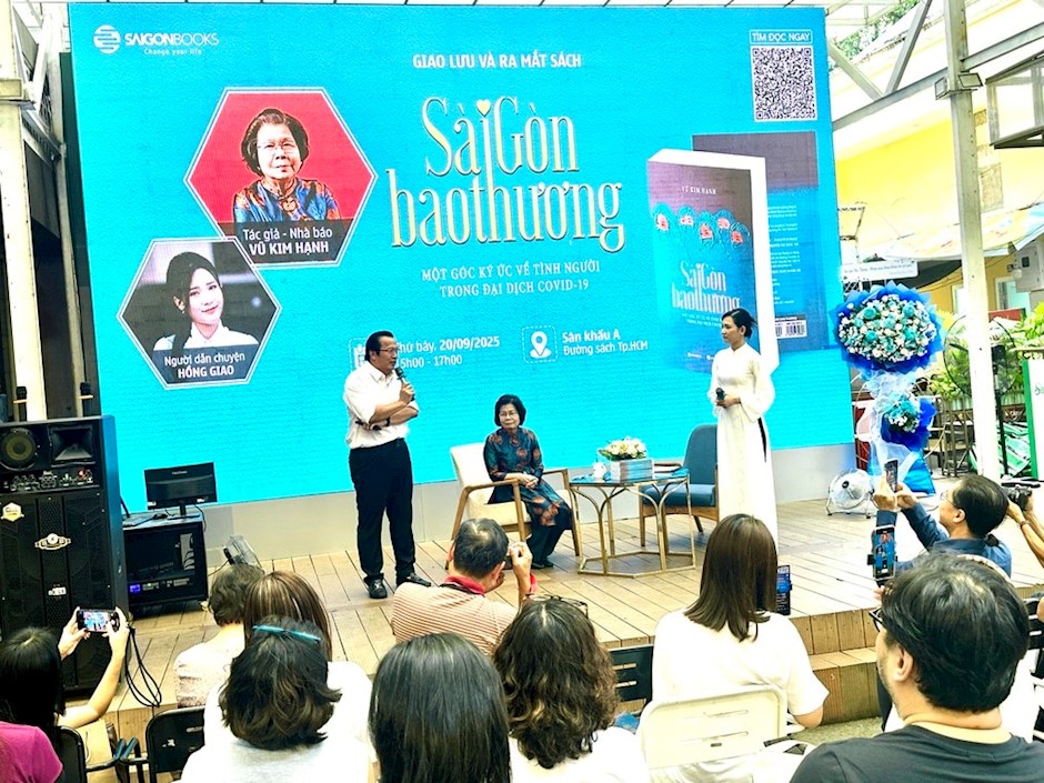 Nhà báo Vũ Kim Hạnh (ngồi) và ông Nguyễn Tuấn Quỳnh, Chủ tịch HĐQT Saigon Books, cũng là người khích lệ nhà báo Vũ Kim Hạnh chuyển những trang nhật ký thành cuốn sách "Sài Gòn bao thương"Chiều 20/9, tại Đường sách TPHCM, Saigon Books tổ chức chương trình giao lưu với tác giả, nhà báo Vũ Kim Hạnh, nhân dịp ra mắt ấn phẩm "Sài Gòn bao thương" (NXB Hồng Đức).