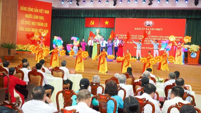 Văn nghệ chào mừng lễ kỷ niệm. (Ảnh: SGGP)Chiều 28/8, Đảng ủy xã Tân Nhựt (TPHCM) tổ chức Lễ kỷ niệm 80 năm Cách mạng Tháng Tám thành công, Quốc khánh nước Cộng hòa xã hội chủ nghĩa Việt Nam và trao tặng Huy hiệu Đảng đợt 2/9.