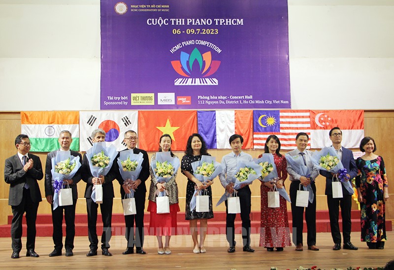 TS.NSƯT Hoàng Ngọc Long, Quyền Giám đốc Nhạc viện TPHCM (ngoài cùng, bên trái), Trưởng BTC và TS. Trần Kiều Lại Thủy, Phó Trưởng BTC cuộc thi tặng hoa cho hội đồng giám khảo(Thanhuytphcm.vn) - Tối 6/7, Nhạc viện TPHCM đã tổ chức Lễ khai mạc và hòa nhạc chào mừng Cuộc thi Piano TP.HCM năm 2023 (tên tiếng Anh: HCMC Piano Competition 2023).