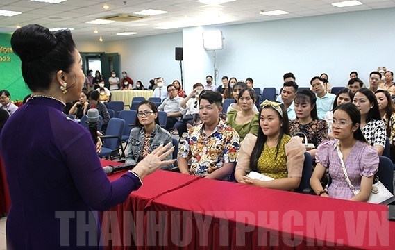 NSND Bạch Tuyết động viên các thí sinh vào vòng tuyển chọn Chuông vàng vọng cổ 2022(Thanhuytphcm.vn) - Chiều 29/7, Đài Truyền hình TPHCM tổ chức họp báo thông tin về cuộc thi Chuông vàng vọng cổ 2022 với 28 thí sinh lọt vào vòng tuyển chọn, tiếp tục tranh tài chọn ra 9 thí sinh xuất sắc nhất vào vòng chung kết.
