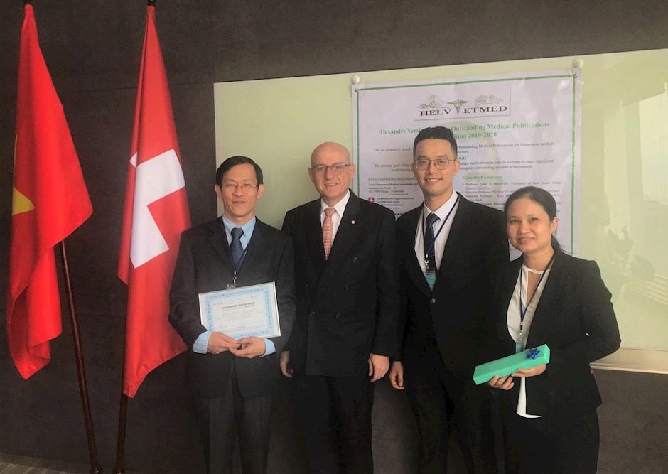 BS Đặng Quang Vinh và cộng sự nhận Giải thưởng Alexandre Yersin lần II do Tổng Lãnh sự Thụy sĩ tại TPHCM Martin Maier trao tặng. (Ảnh: BTC)(Thanhuytphcm.vn) - Thông tin từ Tổng lãnh sự quán Thụy Sĩ tại TPHCM cho biết Giải thưởng Alexandre Yersin lần II (năm 2019 - 2020) đã chọn vinh danh 3 công trình xuất sắc của: BS Đặng Quang Vinh và cộng sự (Bệnh viện Mỹ Đức, TPHCM), BS Nguyễn Thị Kim Phương và cộng sự (Bệnh viện Phụ sản - Nhi, Đà Nẵng), TS Ngô Tất Trung và cộng sự (Bệnh viện 108, Hà Nội). Giải thưởng là sáng kiến của Hội Y khoa Thụy Sỹ - Việt Nam (HELVIETMED) nhằm vinh danh các công trình nghiên cứu xuất sắc, ghi nhận đóng góp của các nhà khoa học Việt Nam cho y văn quốc tế.
