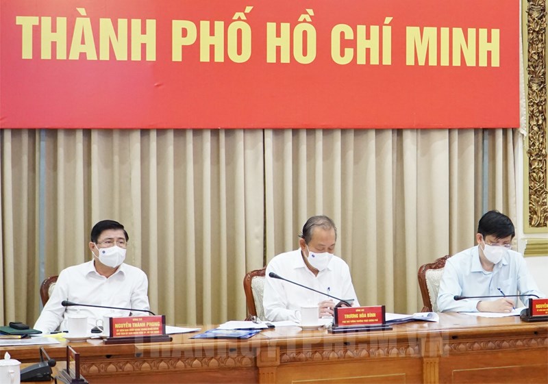 Phó Thủ tướng Thường trực Chính phủ Trương Hòa Bình, Chủ tịch UBND TP Nguyễn Thành Phong, Bộ trưởng Bộ Y tế Nguyễn Thanh Long tại buổi làm việc. (Ảnh: Đan Như)(Thanhuytphcm.vn) – Tại buổi làm việc của Đoàn Công tác Chính phủ do Phó Thủ tướng Thường trực Trương Hòa Bình với Ban Chỉ đạo Phòng chống dịch COVID-19 diễn ra sáng 1/6, Giám đốc Sở Y tế TPHCM Nguyễn Tấn Bỉnh cho biết, từ 18 giờ ngày 31/5 đến 6 giờ ngày 1/6, Trung tâm Kiểm soát bệnh tật TP ghi nhận 11 trường hợp có kết quả xét nghiệm dương tính với COVID-19.