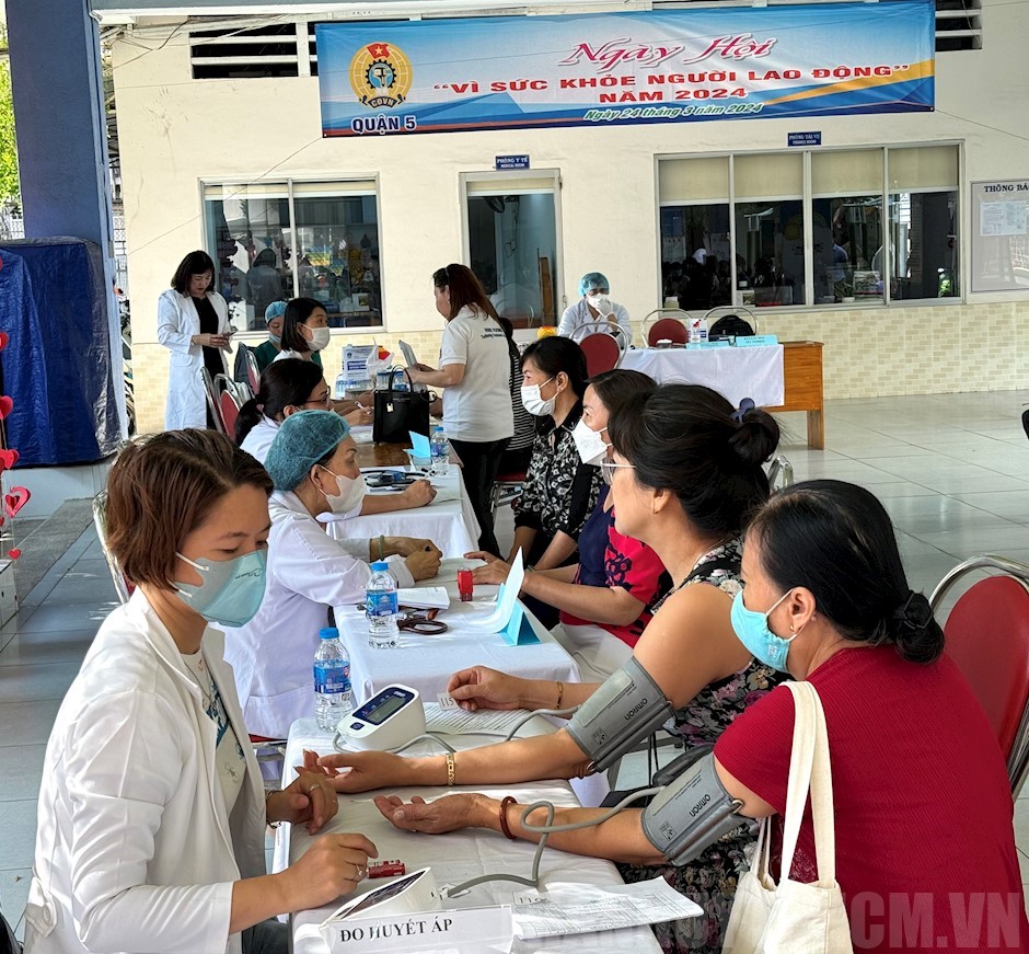 Tại chương trình, 400 đoàn viên Công đoàn, người lao động trên địa bàn Quận 5 tham gia khám sức khỏe miễn phí bao gồm: đo huyết áp, tư vấn sức khỏe hậu Covid-19, bệnh lý khác; tầm soát virus Viêm gan B; khám nội khoa, khám tư vấn phụ khoa, tầm soát bệnh đái tháo đường, tầm soát ung thư gan, siêu âm tuyến vú…