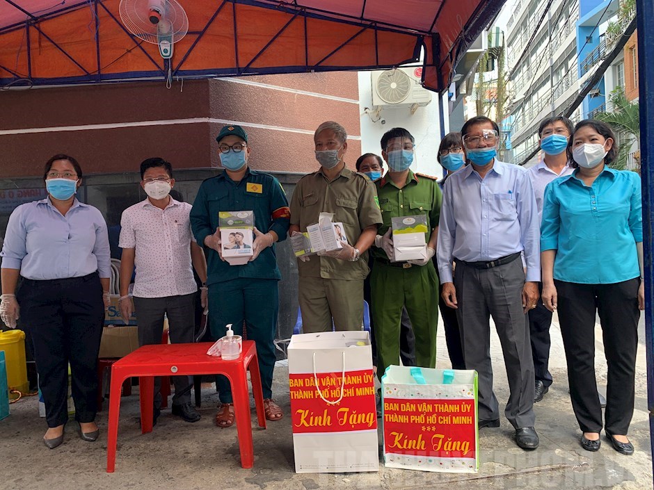 Phó Trưởng Ban Dân vận Thành ủy Lê Văn Tân đã thăm hỏi, động viên Ban Dân vận Quận ủy và lực lượng phường tham gia trực điểm chốt phong tỏa, đồng thời, đã trao tặng các vật phẩm như khẩu trang y tế, kính chắn giọt bắn… góp phần tiếp sức cho các lực lượng quyết tâm thực hiện tốt nhiệm vụ phòng chống dịch trên địa bàn.