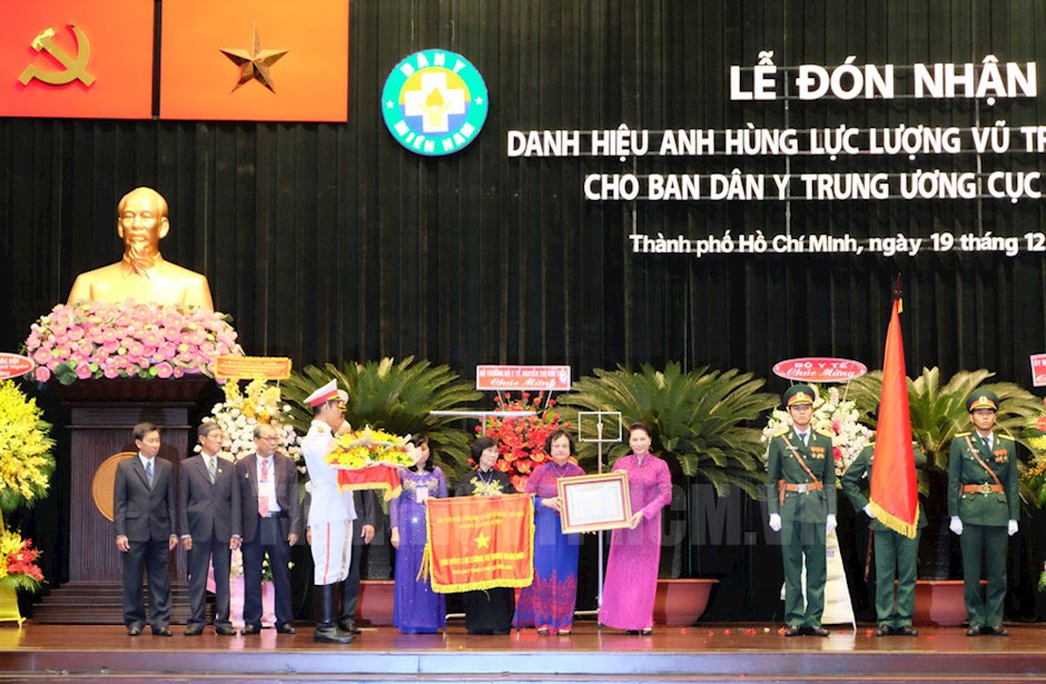 Chủ tịch Quốc hội Nguyễn Thị Kim Ngân trao danh hiệu Anh hùng Lực lượng Vũ trang Nhân dân cho Ban Dân y Trung ương cục miền Nam.(Thanhuytphcm.vn) - Kỷ niệm 74 năm Ngày thành lập quân đội Nhân dân Việt Nam (22/12/1944 - 22/12/2018), 29 năm Ngày hội Quốc phòng toàn dân, sáng 19/12, Thành ủy TPHCM, Bộ Y tế và Câu lạc bộ truyền thống Dân y miền Nam tổ chức lễ đón nhận danh hiệu Anh hùng Lực lượng Vũ trang Nhân dân cho Ban Dân y Trung ương cục miền Nam nhằm ghi nhận công lao các thế hệ thầy thuốc đã hoàn thành xuất sắc nhiệm vụ, góp phần giải phóng miền Nam thống nhất đất nước.