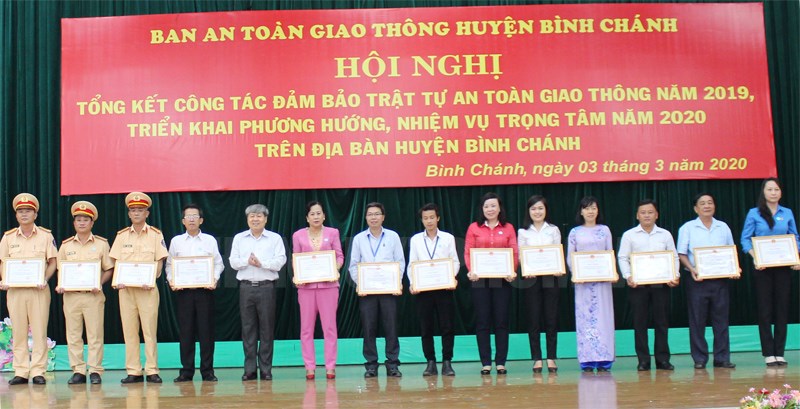 Phó trưởng ban chuyên trách Ban An toàn giao thông TPHCM Nguyễn Ngọc Tường (thứ 5 từ trái sang) trao tặng giấy khen cho các tập thể thực hiện tốt đảm bảo trật tự an toàn giao thông(Thanhuytphcm.vn) - Sáng 3/3, Ban An toàn giao thông huyện Bình Chánh tổ chức Hội nghị tổng kết công tác đảm bảo trật tự an toàn giao thông năm 2019 và triển khai phương hướng, nhiệm vụ trong năm 2020 trên địa bàn huyện. Đến dự có các đồng chí: Nguyễn Ngọc Tường, Phó trưởng ban chuyên trách Ban An toàn giao thông TPHCM; Nguyễn Văn Tài, Phó Chủ tịch UBND huyện, Phó trưởng Ban An toàn giao thông huyện Bình Chánh…