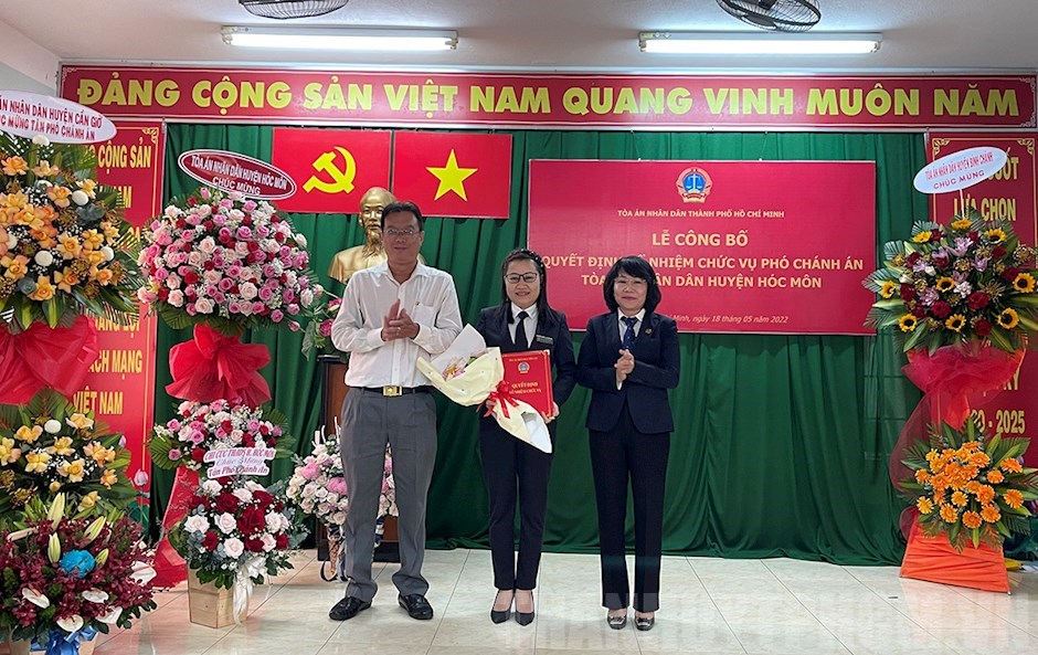 Tại buổi lễ, đại diện TAND TPHCM đã công bố Quyết định số 497/QĐ-TCCB ngày 9/5/2022 của TAND Tối cao về việc bổ nhiệm đồng chí Phạm Thị Thanh, sinh năm 1980, Thẩm phán sơ cấp, Chánh tòa Tòa Dân sự TAND huyện Hóc Môn giữ chức vụ Phó Chánh án TAND huyện Hóc Môn. Thời gian giữ chức vụ 5 năm kể từ ngày 15/5/2022.