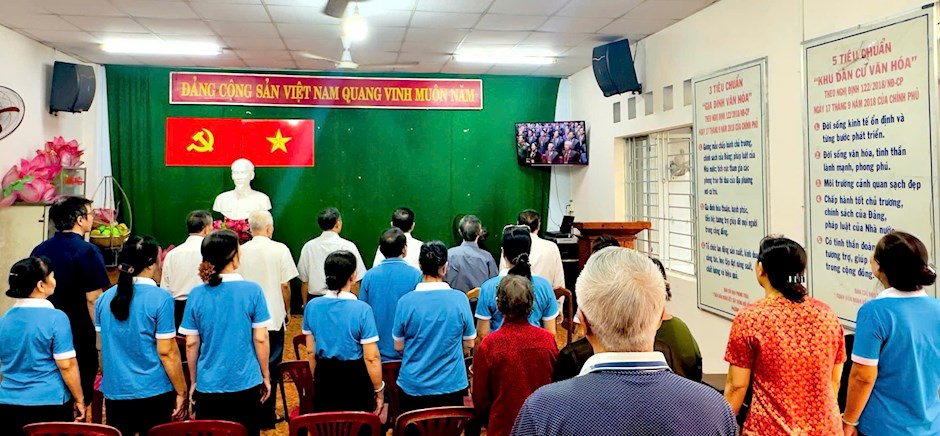 Đảng viên, hội viên Chi bộ Khu phố 9, phường Tân Sơn Nhất chào cờ và xem Lễ khai mạc Đại hội XIV của Đảng. (Ảnh: SGGP)