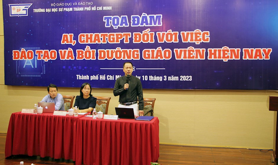Hiệu trưởng Trường Đại học Sư phạm TPHCM Huỳnh Văn Sơn chia sẻ tại tọa đàm(Thanhuytphcm.vn) - Sáng 10/3, Trường Đại học (ĐH) Sư phạm TPHCM tổ chức tọa đàm khoa học “AI, ChatGPT đối với việc đào tạo và bồi dưỡng giáo viên hiện nay”. Diễn đàn thu hút sự tham gia của đông đảo chuyên gia, nhà quản lý giáo dục, giảng viên, giáo viên, sinh viên và những người quan tâm.