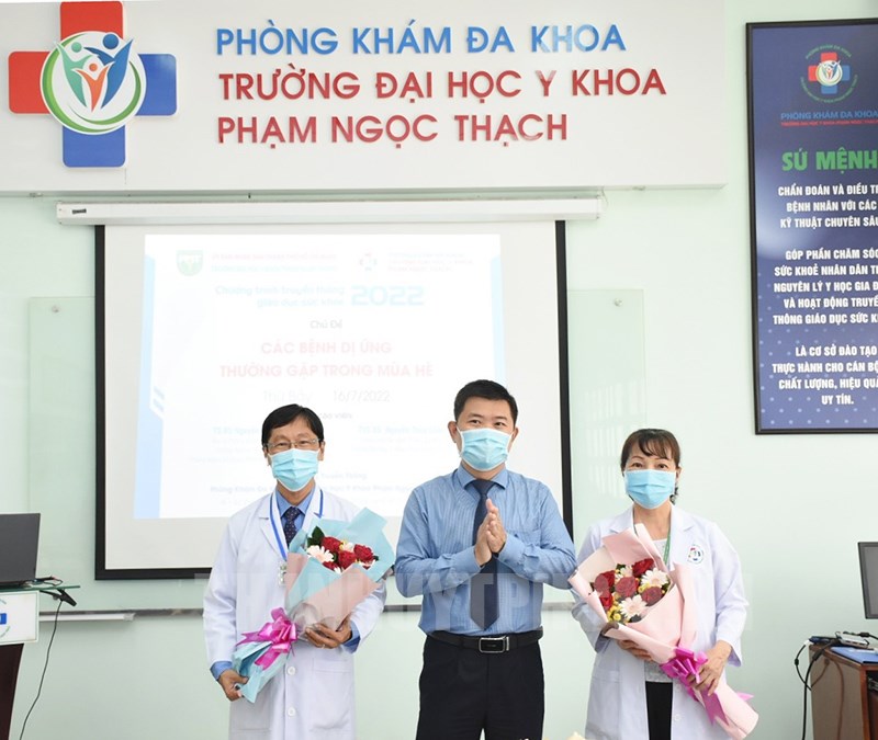 PGS. TS. BS. Nguyễn Thanh Hiệp tặng hoa cho các báo cáo viên tại chương trình.(Thanhuytphcm.vn) - Sáng 16/7, Phòng khám Đa khoa Trường Đại học Y khoa Phạm Ngọc Thạch tổ chức chương trình truyền thông giáo dục sức khỏe (hình thức trực tiếp và trực tuyến) chủ đề: “Các bệnh dị ứng thường gặp trong mùa hè”.