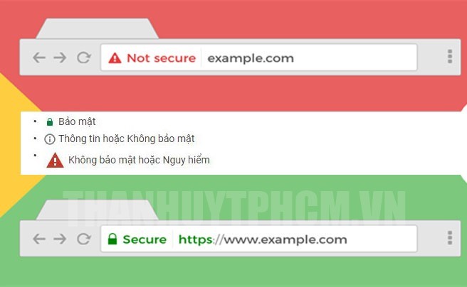 Biểu tượng thông báo mức độ bảo mật trong trình duyệt web hiện nay. Ảnh: Quốc Việt(Thanhuytphcm.vn) – Nhằm tăng khả năng bảo mật, cải thiện niềm tin người dùng khi duyệt web, mới đây Google đã bắt đầu đưa ra cảnh báo Not Secure – “Không an toàn” thay vì biểu tượng dấu chấm cảm như hiện nay đối với những trang web mà địa chỉ đường link không có Https.