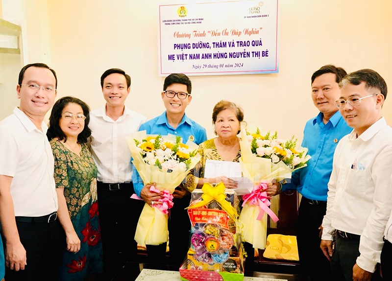 Đại diện Trung tâm Công tác Xã hội Công đoàn TP đến thăm và tặng quà cho mẹ Nguyễn Thị Bê(Thanhuytphcm.vn) - Trưa 29/1, Trung tâm Công tác xã hội Công đoàn – Liên đoàn Lao động TPHCM phối hợp UBND Quận 3 tổ chức chương trình “Đền ơn đáp nghĩa” phụng dưỡng, thăm và trao quà cho Mẹ Việt Nam anh Hùng Nguyễn Thị Bê.