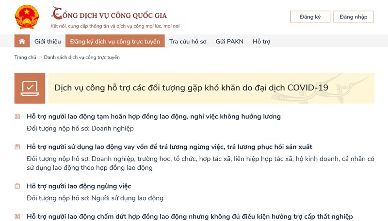 Thực hiện Quyết định số 23/2001/QĐ-TTg của Thủ tướng Chính phủ, Văn phòng Chính phủ đã phối hợp với Bộ Lao động – Thương binh và Xã hội và các cơ quan liên quan cung cấp các dịch vụ công trực tuyến hỗ trợ người lao động và người sử dụng lao động gặp khó khăn do đại dịch Covid-19 trên Cổng Dịch vụ công Quốc gia. Theo thống kê, đến hết ngày 13/10/2021, Cổng Dịch vụ công Quốc gia đã tiếp nhận 53.460 hồ sơ, trong đó, đã xử lý xong 2.320 hồ sơ, đang xử lý quá hạn 6.861 hồ sơ, từ chối 41.286 hồ sơ.