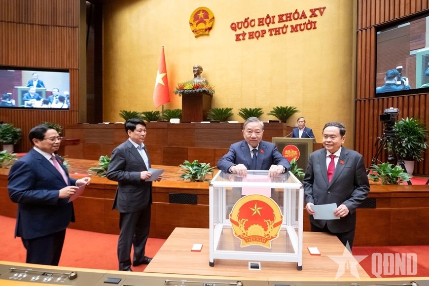 Tổng Bí thư Tô Lâm và các đồng chí lãnh đạo Đảng, Nhà nước bỏ phiếu bầu Chánh án Tòa án nhân dân Tối cao nhiệm kỳ 2021-2026. (Ảnh: QDND.vn)Sáng 10/11, tiếp tục chương trình làm việc Kỳ họp thứ mười, dưới sự chủ trì của Chủ tịch Quốc hội Trần Thanh Mẫn, Quốc hội khóa XV họp riêng để quyết định về công tác nhân sự. Quốc hội đã thông qua nghị quyết bầu đồng chí Nguyễn Văn Quảng giữ chức Chánh án Tòa án nhân dân Tối cao nhiệm kỳ 2021-2026.