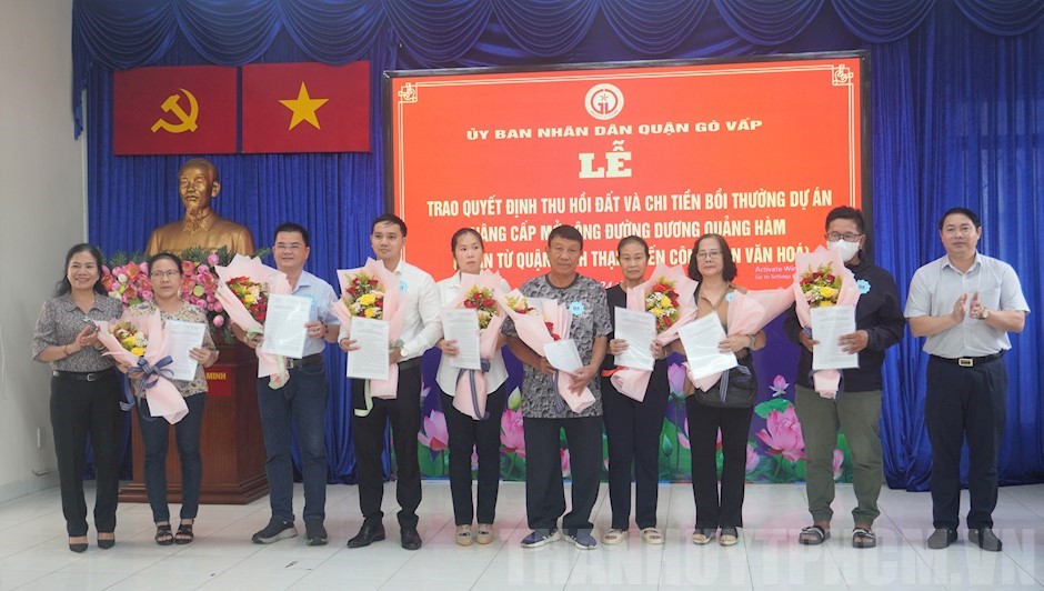 Lãnh đạo quận Gò Vấp trao Quyết định thu hồi đất cho các hộ dân Phường 5.(Thanhuytphcm.vn) - Sáng 24/7, tại trụ sở UBND Phường 5, UBND quận Gò Vấp đã tổ chức Lễ trao Quyết định thu hồi đất và chi trả tiền bồi thường cho các hộ dân trên địa bàn Phường 5 bị ảnh hưởng bởi dự án Nâng cấp, mở rộng đường Dương Quảng Hàm (đoạn từ quận Bình Thạnh đến Công viên Văn hóa) quận Gò Vấp.