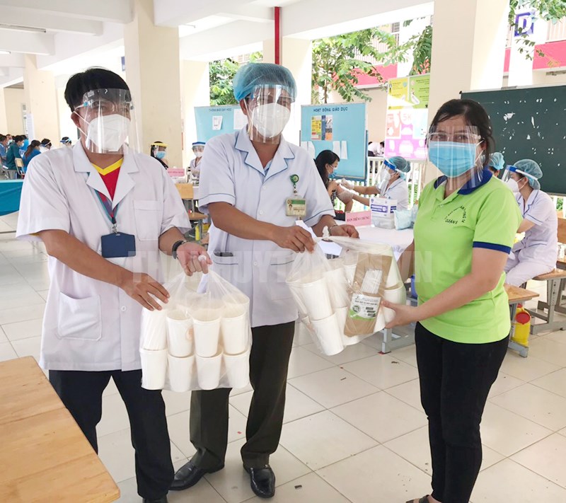 Chị Quyên nấu và trưc tiếp trao tặng những ly nước mát cho lực lượng hỗ trợ điểm tiêm vaccine(Thanhuytphcm.vn) - Khi dịch bệnh bùng phát, giữa những lúc khó khăn, tinh thần nhường cơm, sẻ áo, trợ giúp nhau… của các tầng lớp nhân dân lại được thể hiện sinh động và rõ nét. Không xa lạ với hình ảnh của những hội viên phụ nữ nhiệt huyết, đi đầu trong công tác hậu phương tiếp sức không chỉ cho các lực lượng tuyến đầu phòng chống dịch, mà còn là nguồn cổ vũ tinh thần, chăm sóc bữa ăn đủ dinh dưỡng cho các F0 yên tâm chiến đấu và chiến thắng dịch bệnh,… trong hình ảnh đó có chị Vũ Thị Quyên - hội viên phụ nữ Khu phố 2, Phường 11, Quận 6, hiện là chủ tiệm bánh – nước The Quin.