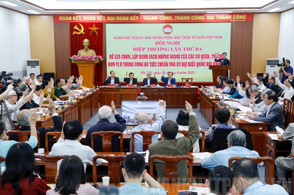 Các đại biểu biểu quyết thông qua(Thanhuytphcm.vn) - Ngày 16/4, tại Hà Nội, Đoàn Chủ tịch Ủy ban Trung ương MTTQ Việt Nam tổ chức Hội nghị hiệp thương lần thứ 3 để lựa chọn, lập danh sách những người của cơ quan, tổ chức, đơn vị ở Trung ương đủ tiêu chuẩn ứng cử đại biểu Quốc hội (ĐBQH) khóa XV.