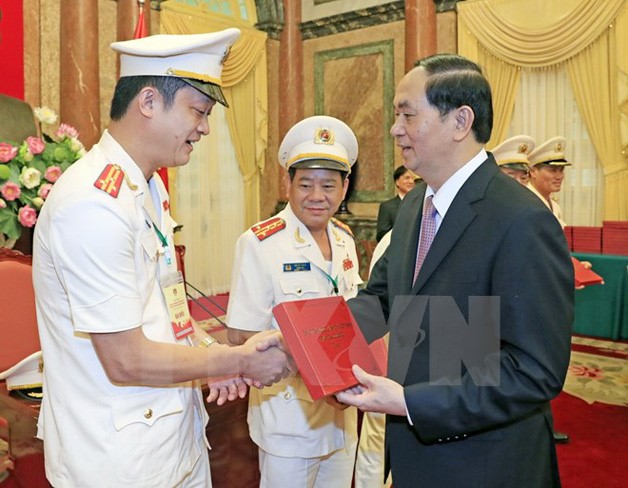 Tại buổi gặp mặt, thay mặt lãnh đạo Ðảng, Nhà nước, Chủ tịch nước Trần Đại Quang biểu dương, khen ngợi sự nỗ lực phấn đấu, những chiến công, thành tích đặc biệt xuất sắc mà lực lượng cảnh sát nhân dân đã đạt được trong suốt chặng đường vẻ vang 55 năm qua.