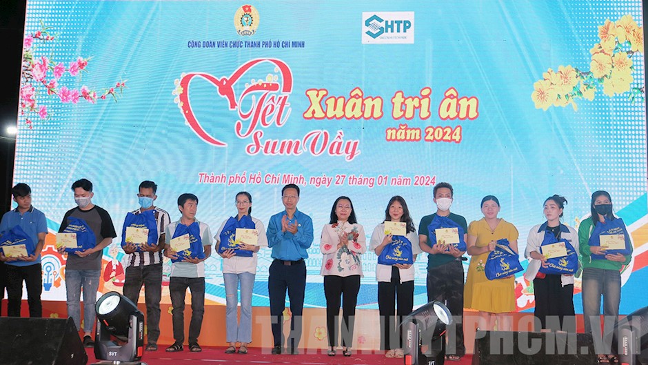 Đại diện các gia đình đoàn viên công đoàn, công nhân, người lao động có hoàn cảnh khó khăn, không về quê ăn tết nhận quà hỗ trợ từ chương trình(Thanhuytphcm.vn) – Tối 27/1, tại Nhà Văn hóa Lao động Khu Công nghệ cao TPHCM, Công đoàn Viên chức TPHCM và Ban Quản lý Khu Công nghệ cao TPHCM tổ chức Chương trình “Tết sum vầy - Xuân tri ân” năm 2024 và tổng kết hoạt động Phiên chợ nghĩa tình năm 2024.