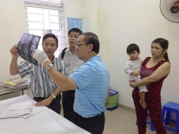 PGS.TS.BS Lê Tấn Sơn, Trưởng khoa Niệu Bệnh viện Nhi Đồng 2 (đeo kính) đang trao đổi kết quả chụp phim X-quang của một bệnh nhi