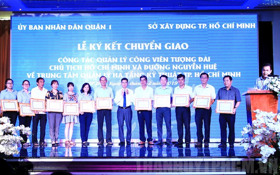 Tặng Giấy khen cho tập thể, cá nhân đã hoàn thành tốt nhiệm vụ(Thanhuytphcm.vn) - Sáng 31/12, Sở Xây dựng TPHCM phối hợp UBND Quận 1 tổ chức lễ ký kết chuyển giao Ban Quản lý Công viên Tượng đài Chủ tịch Hồ Chí Minh và đường Nguyễn Huệ về Trung tâm Quản lý Hạ tầng kỹ thuật TPHCM. Tham dự có các đồng chí: Nguyễn Bá Thành, Phó Giám đốc Sở Xây dựng TPHCM; Nguyễn Văn Dũng, Chủ tịch UBND Quận 1.