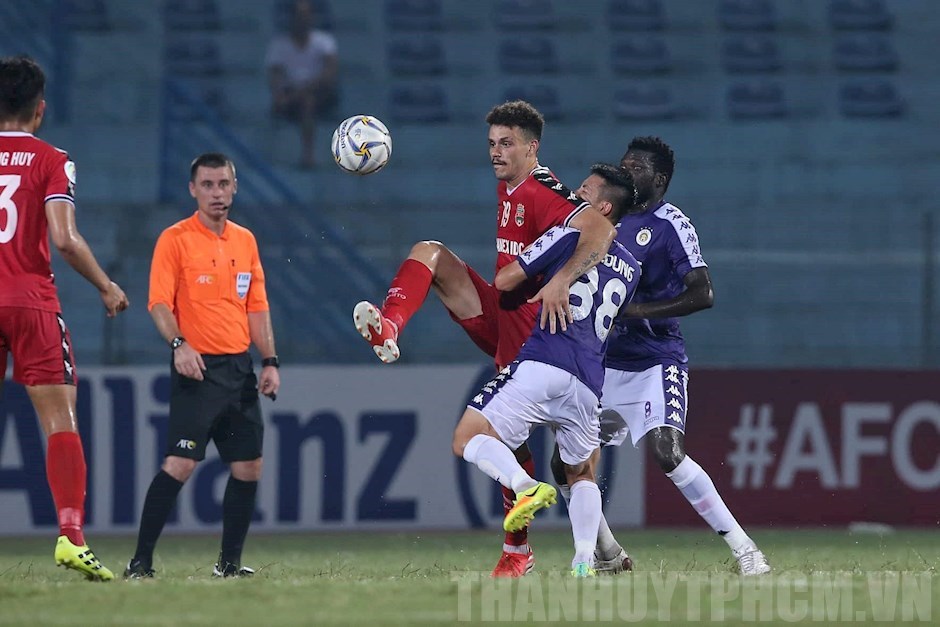 Các hậu vệ Hà Nội nỗ lực ngăn chặn tiền đạo Pedro (Bình Dương). Ảnh: Minh Hoàng(Thanhuyrphcm.vn) - Hai CLB Hà Nội và Bình Dương đã hoàn tất chuỗi 3 lần gặp nhau chỉ trong 8 ngày bằng trận chung kết lượt về AFC Cup 2019 khu vực Đông Nam Á trên sân Hàng Đẫy vào tối 7/8. Một lần nữa CLB Hà Nội đã giành chiến thắng để dẫn đầu khu vực Đông Nam Á tại giải đấu này.