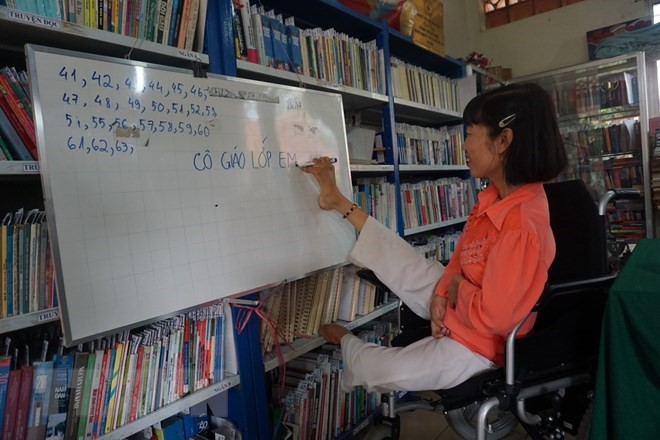 Chị Huỳnh Thị Xậm dùng chân không bị liệt để dạy chữ cho học viên. (Ảnh: TTXVN)Chị Xậm cho biết lớp học hiện có hơn 20 học sinh, tùy khóa học có thể đông hơn. Học trò của chị Xậm là những học viên đang theo học nghề tại Trung tâm, dù độ tuổi từ 15-35 tuổi nhưng chưa biết chữ. Tại đây, học sinh được học chữ, học tính toán, kiến thức mà cô Xậm truyền đạt nằm trong khoảng từ lớp 1 đến lớp 3, tùy theo khả năng tiếp thu của mỗi em.
