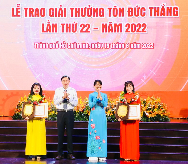 Đồng chí Trần Thị Diệu Thúy, Chủ tịch LĐLĐ TP và đồng chí Phạm Văn Trường, Phó Tổng Biên tập Báo Sài Gòn Giải Phóng trao Giải thưởng Tôn Đức Thắng năm 2022.(Thanhuytphcm.vn) - Ngày 2/8, Liên đoàn Lao động (LĐLĐ) TPHCM phối hợp Hội đồng xét chọn Giải thưởng Tôn Đức Thắng đã thống nhất chọn 11 cá nhân đoạt Giải thưởng Tôn Đức Thắng năm 2023.