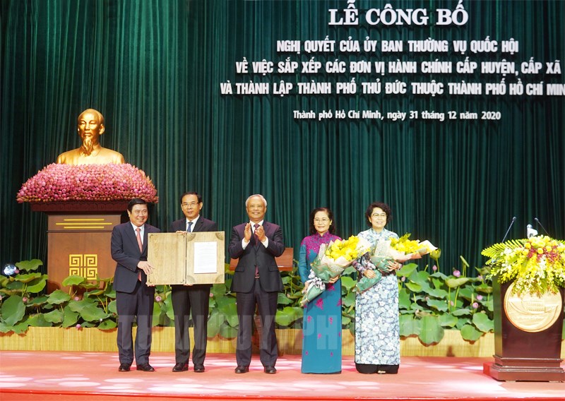 Phó Chủ tịch Quốc hội Uông Chu Lưu trao Nghị quyết của Ủy ban Thường vụ Quốc hội về việc sắp xếp các đơn vị hành chính cấp huyện, cấp xã và thành lập TP Thủ Đức thuộc TPHCM cho lãnh đạo TPHCM. (Ảnh: Nhật Quang)(Thanhuytphcm.vn)- Sáng 31/12, Thành ủy, HĐND, UBND, Ủy ban MTTQ Việt Nam TPHCM tổ chức lễ công bố Nghị quyết của Ủy ban Thường vụ Quốc hội về việc sắp xếp các đơn vị hành chính cấp huyện, cấp xã và thành lập TP Thủ Đức thuộc TPHCM.