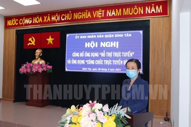 Đồng chí Phạm Thị Ngọc Diệu phát biểu tại hội nghị(Thanhuytphcm.vn) - Sáng 28/5, Phó Chủ tịch UBND quận Bình Tân Phạm Thị Ngọc Diệu đã chủ trì hội nghị công bố ứng dụng “Hỗ trợ trực tuyến” và ứng dụng “Công chức trực tuyến Bình Tân”.
