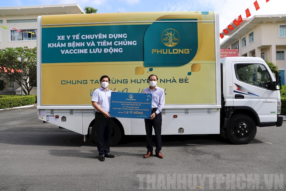 Đại diện Công ty Địa ốc Phú Long trao tặng xe y tế chuyên dụng khám bệnh và tiêm chủng cho huyện Nhà Bè(Thanhuytphcm.vn) - Sáng 8/9, tại huyện Nhà Bè, Công ty Địa ốc Phú Long - Tập đoàn Sovico đã trao tặng huyện Nhà Bè xe y tế chuyên dụng khám bệnh và tiêm chủng vaccine lưu động. Đến dự chương trình có Bí thư Huyện ủy huyện Nhà Bè Dương Thế Trung; Chủ tịch UBND huyện Nhà Bè Triệu Đỗ Hồng Phước; Tổng Giám đốc Công ty Địa ốc Phú Long Phùng Chu Cường.