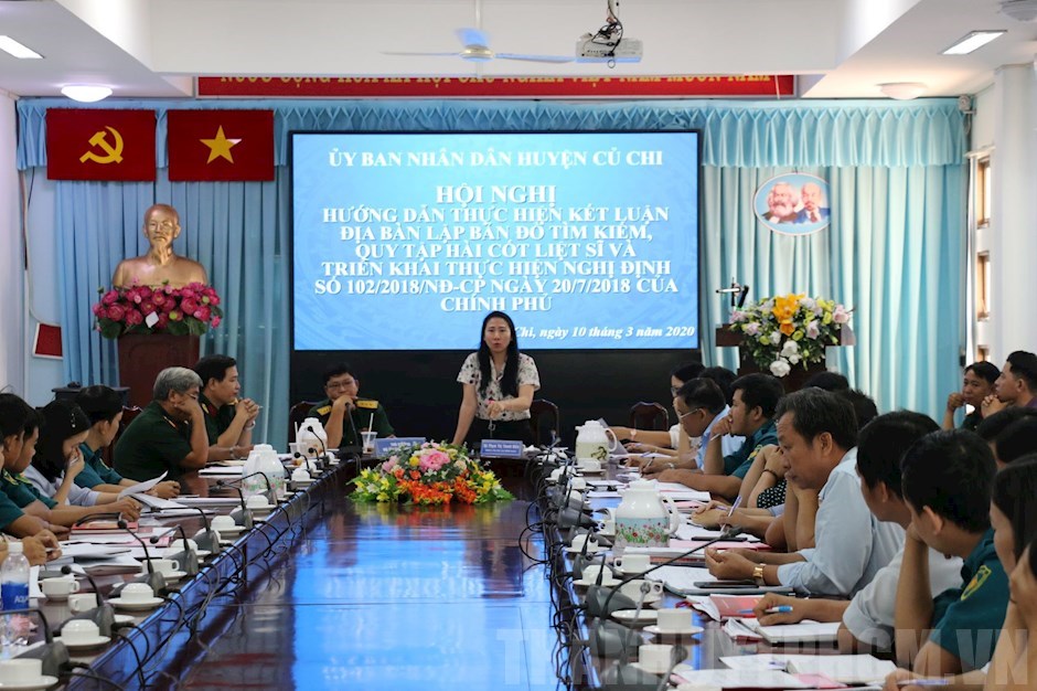 Phó Chủ tịch UBND huyện Phạm Thị Thanh Hiền phát biểu tại hội nghị(Thanhuytphcm.vn) - Ngày 10/3, UBND huyện Củ Chi đã tổ chức hội nghị hướng dẫn thực hiện kết luận địa bàn lập bản đồ tìm kiếm quy tập hài cốt liệt sĩ và triển khai thực hiện nghị định số 102/2019/NĐ – CP của Chính phủ quy định chế độ hỗ trợ và một số chế độ đãi ngộ đối với người Việt Nam có công với cách mạng, người tham gia kháng chiến, chiến tranh bảo vệ Tổ quốc và làm nhiệm vụ quốc tế đang định cư ở nước ngoài. Đồng chí Phạm Thị Thanh Hiền, Phó Chủ tịch UBND huyện chủ trì hội nghị.