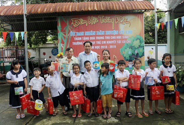 Các đồng chí lãnh đạo tặng quà trung thu cho trẻ khuyết tật.(Thanhuytphcm.vn) - Ngày 21/9, UBND huyện Củ Chi đã tổ chức chương trình “Đêm hội trăng rằm” thăm tặng quà trung thu cho học sinh trường nuôi dạy trẻ khuyết tật Củ Chi năm học 2018 – 2019.