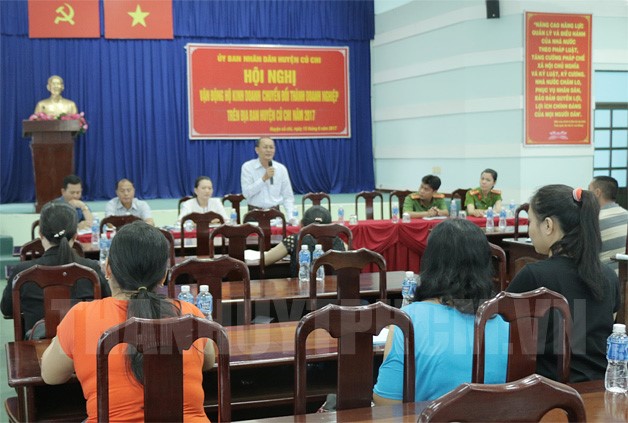 (Thanhuytphcm.vn) - Chiều ngày 15/6, UBND huyện Củ Chi tổ chức hội nghị vận động hộ kinh doanh chuyển đổi thành doanh nghiệp trên địa bàn huyện năm 2017. Tham dự có gần 100 hộ kinh doanh là những hộ có đủ điều kiện chuyển đổi thành doanh nghiệp trên địa bàn huyện (ảnh).