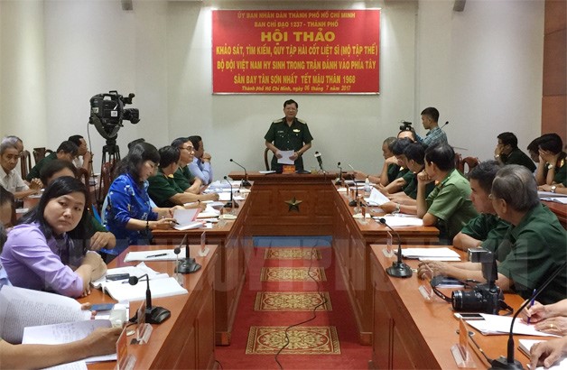 (Thanhuytphcm.vn) - Sáng 6/7, Cơ quan thường trực Ban chỉ đạo 1237 TP, Bộ Tư lệnh TPHCM đã tổ chức hội thảo kháo sát, tìm kiếm, quy tập hài cốt liệt sỹ (mộ tập thể) bộ đội Việt Nam hy sinh trong trận đánh vào phía Tây sân bay Tân Sơn Nhất Tết Mậu Thân 1968. Tham dự hội thảo có lãnh đạo Quân Khu 7, Bộ Tư lệnh TP, các cơ quan chức năng TP, Ban chỉ huy quân sự các tỉnh Đồng Nai, Long An, cựu chiến binh tham gia trận đánh Mậu Thân 1968 cùng một số nhân chứng và các nhà nghiên cứu kỹ thuật quân sự.