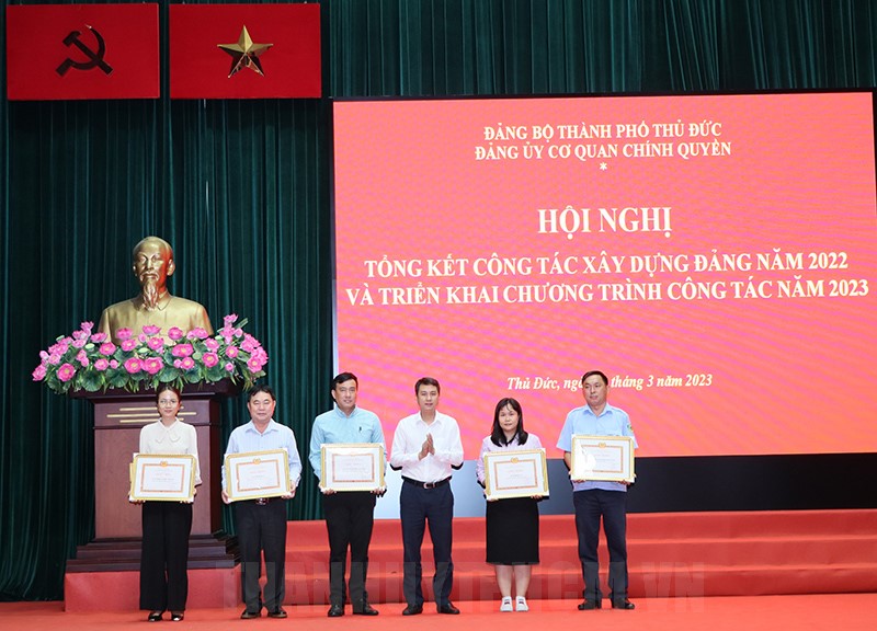 Đồng chí Nguyễn Bạch Hoàng Phụng trao tặng giấy khen đến 5 tập thể hoàn thành xuất sắc nhiệm vụ năm 2022.(Thanhuytphcm.vn) - Ngày 2/3, Đảng bộ Cơ quan Chính quyền (CQCQ) TP Thủ Đức tổ chức hội nghị tổng kết công tác xây dựng Đảng năm 2022 và triển khai chương trình công tác năm 2023. Hội nghị do đồng chí Nguyễn Bạch Hoàng Phụng, Ủy viên Ban Thường vụ Thành ủy, Bí thư Đảng ủy CQCQ, Phó Chủ tịch UBND TP Thủ Đức chủ trì.