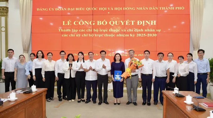 Công bố quyết định thành lập chi bộ Công tác HĐND. (Ảnh: SGGP)Đồng thời, chỉ định đồng chí Huỳnh Thị Phúc, Thành ủy viên, Phó trưởng đoàn ĐBQH TPHCM giữ chức Bí thư chi bộ Công tác Quốc hội nhiệm kỳ 2025-2030; đồng chí Hồ Hiếu Thảo, Phó Chánh Văn phòng đoàn ĐBQH và HĐND TPHCM, giữ chức Phó Bí thư chi bộ.