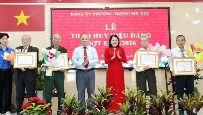 Bí thư Đảng ủy phường Trung Mỹ Tây Nguyễn Thị Ngọc Duyên cùng Phó Bí thư Thường trực Đảng ủy phường Trung Mỹ Tây Lê Văn Cường trao Huy hiệu Đảng đến đảng viên cao tuổi ĐảngSáng 27/1, Đảng ủy phường Trung Mỹ Tây tổ chức lễ kỷ niệm 96 năm Ngày Thành lập Đảng (3/2/1930 – 3/2/2026), trao Huy hiệu Đảng đợt ngày 3/2.
