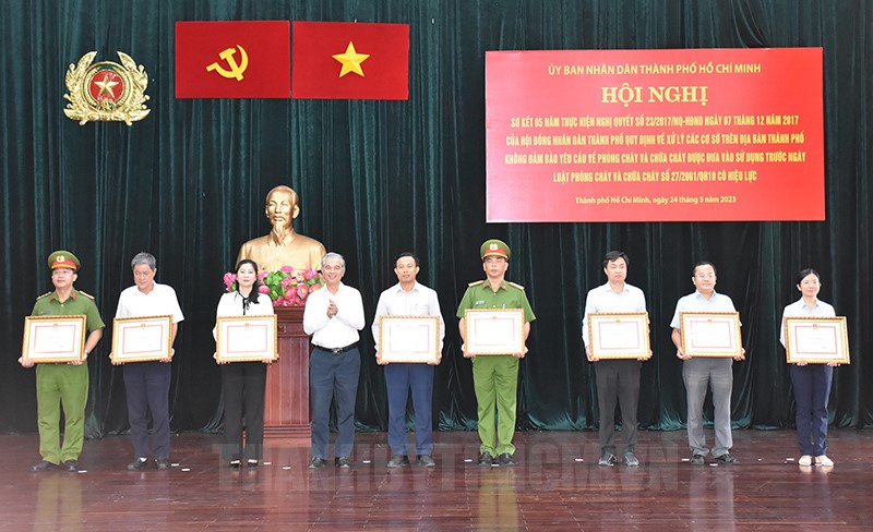 Đồng chí Ngô Minh Châu trao Bằng khen cho các tập thể, cá nhân.(Thanhuytphcm.vn) - Chiều 24/5, UBND TPHCM tổ chức Hội nghị sơ kết 5 năm thực hiện Nghị quyết số 23/2017/NQ-HĐND ngày 7/12/2017 của HĐND TPHCM quy định về xử lý các cơ sở trên địa bàn không đảm bảo yêu cầu về phòng cháy và chữa cháy (PCCC) được đưa vào sử dụng trước ngày Luật PCCC số 27/2001/QH có hiệu lực.