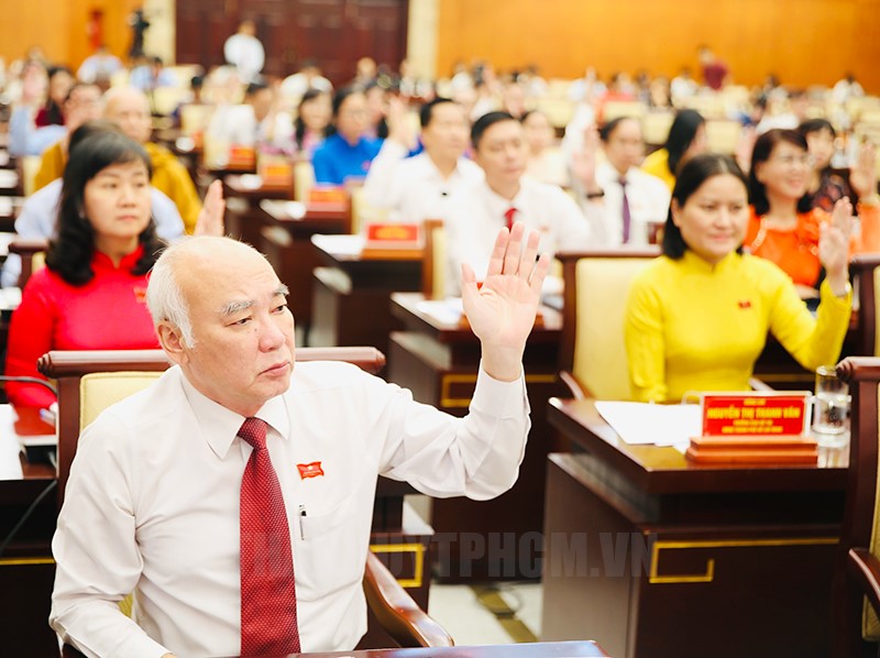 Trưởng ban Tuyên giáo Thành ủy TPHCM Phan Nguyễn Như Khuê cùng các đại biểu biểu quyết thông qua tờ trình(Thanhuytphcm.vn) - Tiếp tục chương trình kỳ họp thứ 14 HĐND TPHCM khóa X, nhiệm kỳ 2021 - 2026, trưa 14/3, các đại biểu HĐND TPHCM biểu quyết thông qua về điều chỉnh chủ trương đầu tư dự án xây dựng mới Nhà Văn hóa Phụ nữ TP - Cơ sở 1.