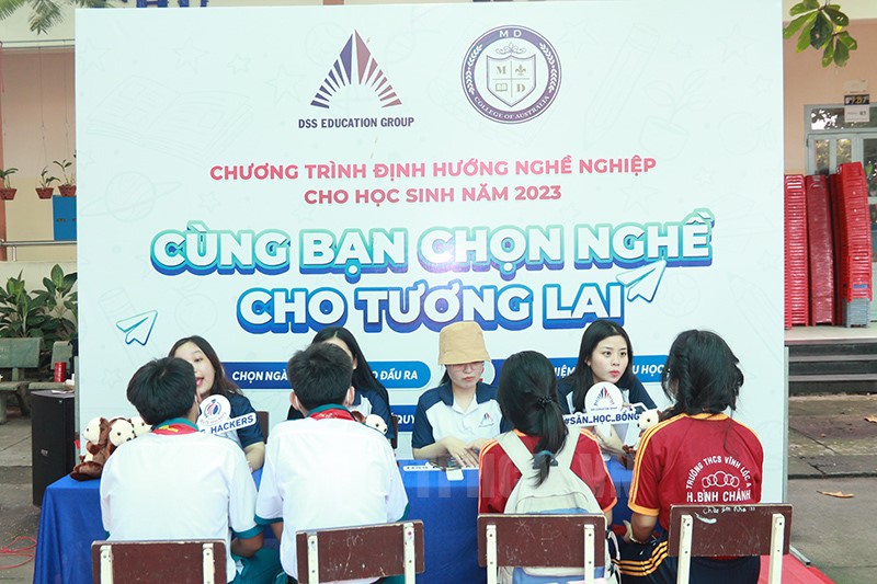 Các em học sinh tham gia tư vấn chọn nghề tại chương trình.(Thanhuytphcm.vn) - Ngày 18/8, Trung tâm Dịch vụ việc làm Thanh niên, Huyện Đoàn Bình Chánh, Huyện Đoàn Hóc Môn, Thành Đoàn Thành phố Thủ Đức và Công ty TNHH JOBTEST phối hợp tổ chức Chương trình định hướng nghề nghiệp cho học sinh năm 2023 với chủ đề “Cùng bạn chọn nghề cho tương lai” với sự đồng hành từ Công ty TNHH Du học định cư DSS. Đây là một trong các nội dung mới của sinh hoạt Hè năm 2023 của Thành Đoàn và Hội Đồng đội Thành phố triển khai và thực hiện.