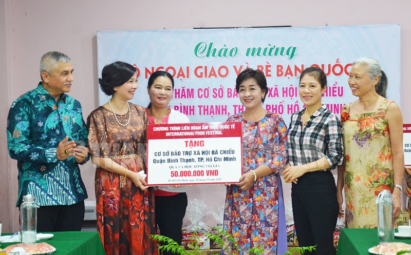 Chủ tịch nhóm cộng đồng nữ ASEAN tại Hà Nội Trần Thị Bích Vân cùng các thành viên đoàn Bộ Ngoại giao tặng quà cho đại diện cơ sở bảo trợ xã hội Mái ấm Bà Chiểu.(Thanhuytphcm.vn) - Sáng 30/10 đoàn đại biểu Bộ Ngoại giao do bà Trần Thị Bích Vân, Chủ tịch nhóm cộng đồng nữ ASEAN tại Hà Nội làm trưởng đoàn cùng đi với các phu nhân, lãnh đạo Bộ Ngoại giao các nước Ấn Độ, Campuchia, Hungary, Indonesia, Singapore, Trung Quốc đến thăm, tặng quà cơ cơ bảo trợ xã hội Mái ấm Bà Chiểu (quận Bình Thạnh).