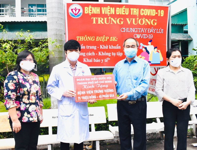 Thay mặt đoàn công tác, ĐBQH Nguyễn Thiện Nhân trân trọng cảm ơn đội ngũ y, bác sĩ, nhân viên làm nhiệm vụ tại bệnh viện đã có nhiều nỗ lực, sự hy sinh để chăm sóc, điều trị bệnh cho người dân mắc Covid-19. Đồng thời mong muốn đội ngũ y, bác sĩ, nhân viên bệnh viện bảo vệ bản thân, mạnh khỏe để cùng chính quyền TP thực hiện chăm sóc, điều trị cho các bệnh nhân Covid-19.