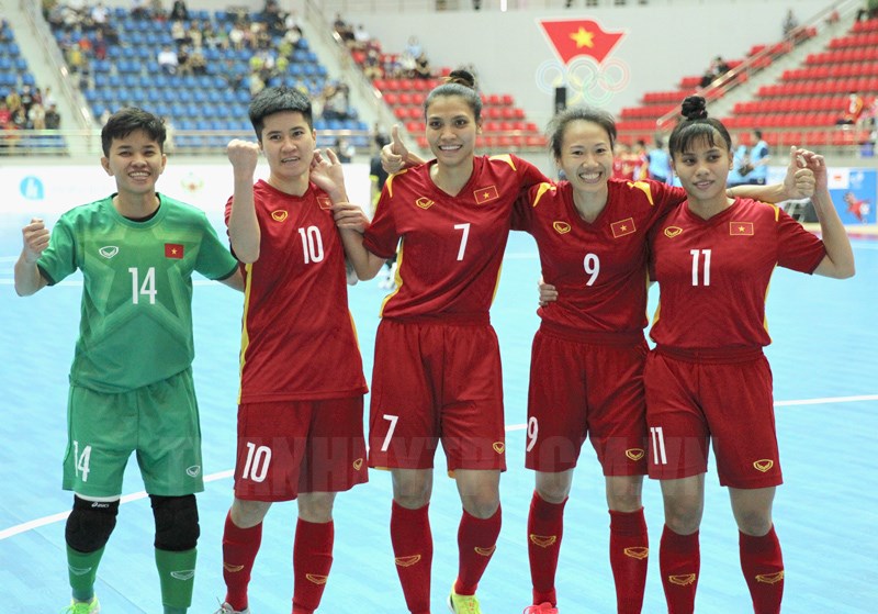 Niềm vui của các cầu thủ nữ futsal Việt Nam sau trận thắng thứ 2 trước Malaysia.(Thanhuytphcm.vn) - Lượt trận thứ hai và là lượt áp chót của môn futsal nữ SEA Games 31 diễn ra vào chiều 17/5, hai đội Việt Nam và Thái Lan đều giành những chiến thắng thuyết phục để chạy đà hoàn hảo trước khi gặp nhau ở lượt cuối. Đó cũng là cuộc so tài mang tính chất như trận tranh chung kết.