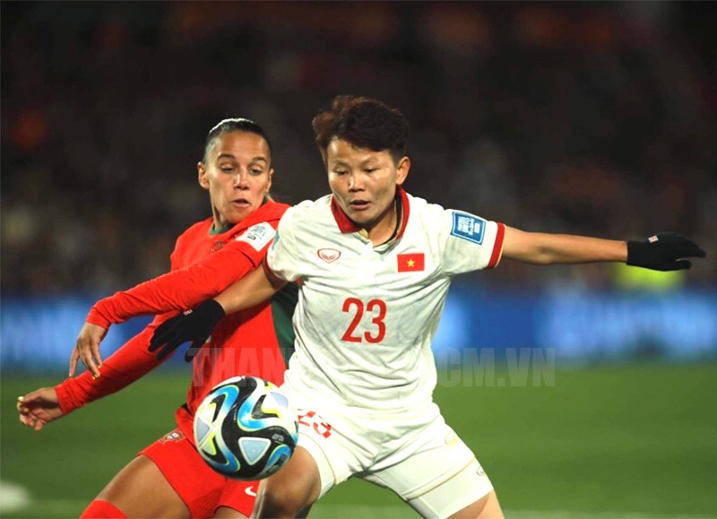 Bích Thùy nỗ lực tranh bóng cùng cầu thủ Bồ Đào Nha. (Ảnh: Trí Công)(Thanhuytphcm.vn) - Điều bất ngờ cuối cùng đã không xảy đến với các cầu thủ Việt Nam trong cuộc so tài cùng đội tuyển nữ Bồ Đào Nha ở lượt trận thứ 2 bảng E VCK World Cup nữ 2023 vào ngày 27/7. Đoàn quân của HLV Mai Đức Chung đã thua 0-2 và chưa thể ghi được bàn thắng nào tại giải lần này theo như mục tiêu.